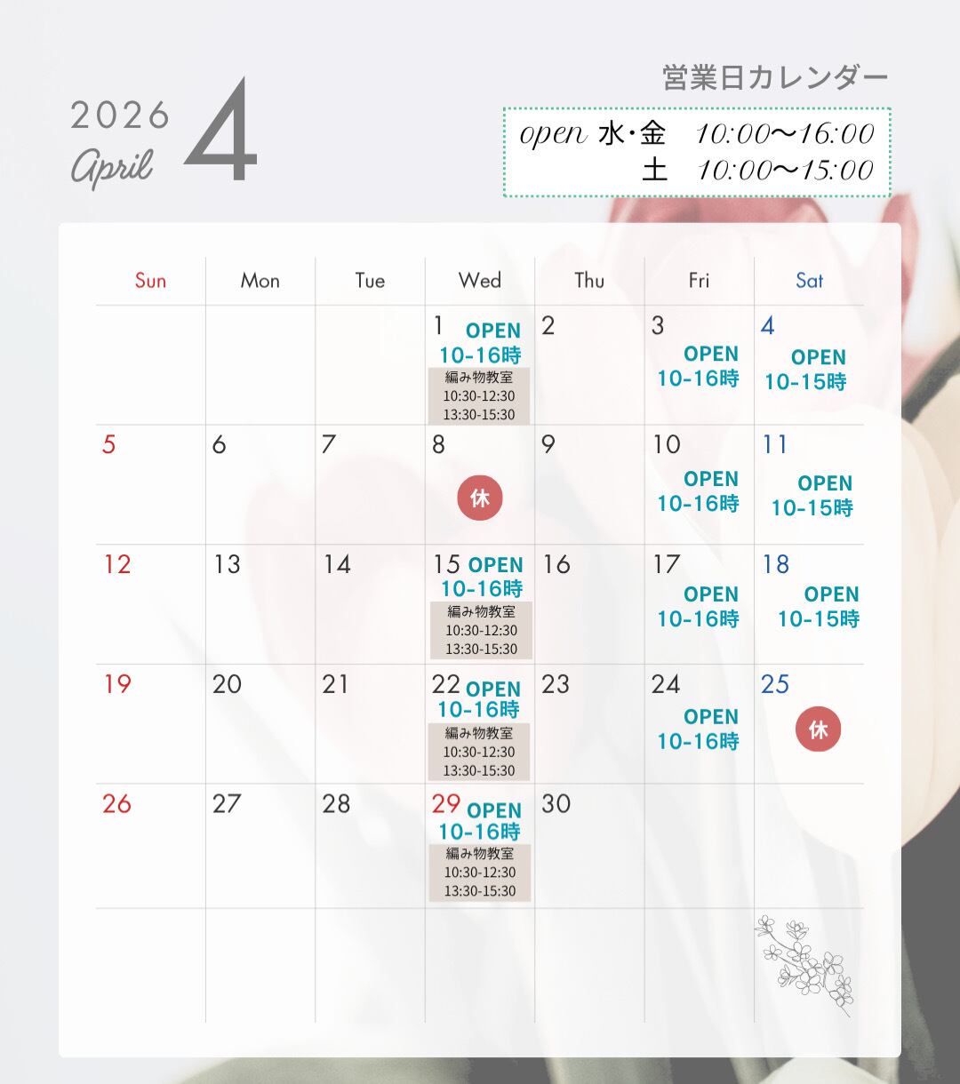 毎週水曜日開催中の編み物教室は空きのある日、時間帯がございますので、お気軽にお問い合わせください。